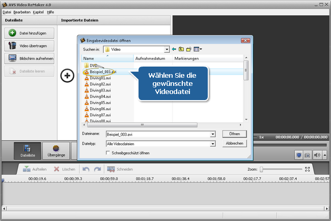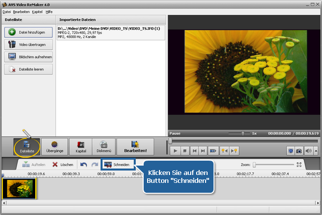 Nachdem Ihre Heim-DVD geladen wurde, kann man weitere Videodateien in den AVS Video ReMaker mit einem Klick auf den Button Datei hinzufügen importieren oder bereits geladene Dateien entfernen, indem man den Button Dateiliste leeren betätigt.