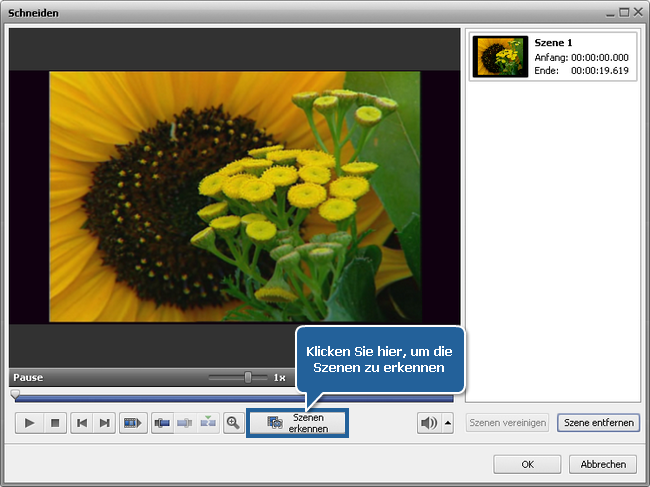 Klicken Sie im geöffneten Fenster auf den Button Szenen erkennen, der unter dem Vorschaubereich liegt und warten Sie, während das Programm Szenen erkennt. Der Vorgang kann einige Zeit in Anspruch nehmen, was von der Dauer der Videodatei abhängt.