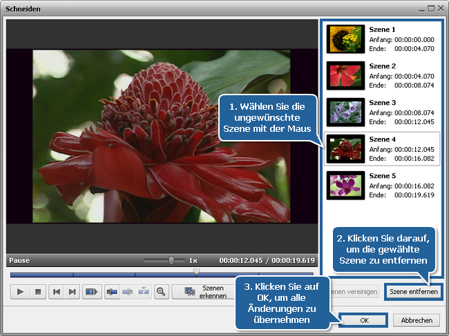 Alle erkannten Szenen werden rechts als Liste angezeigt. Klicken Sie mit der linken Maustaste auf die Szene, die Sie löschen möchten. Um mehrere Szenen zu wählen, drücken Sie auf die Taste Strg und halten Sie diese gedrückt. Klicken Sie auf den Button Szene entfernen unter der Szenenliste, um die markierte(n) Szene(n) zu entfernen. Klicken Sie auf den Button OK, um die durchgeführten Änderungen zu speichern und das Fenster zu schließen.