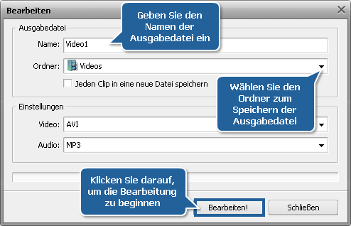 Button Bearbeiten!Nun kann man die Parameter der Ausgabedatei einstellen. Klicken Sie auf den zentralen Button Bearbeiten!, um das Fenster Bearbeiten zu öffnen.