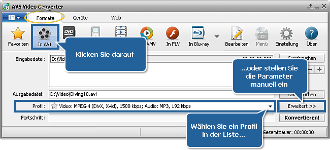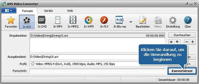 • In AVI, um Video für PC, Archos, Creative ZEN Vision, YouTube, MySpace und Google Video zu erstellen;