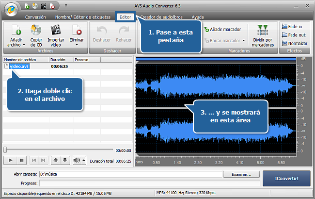 - cambie a la pestaña Editor y haga doble clic en el archivo necesario. La pista de audio se visualizará en el área a la derecha: