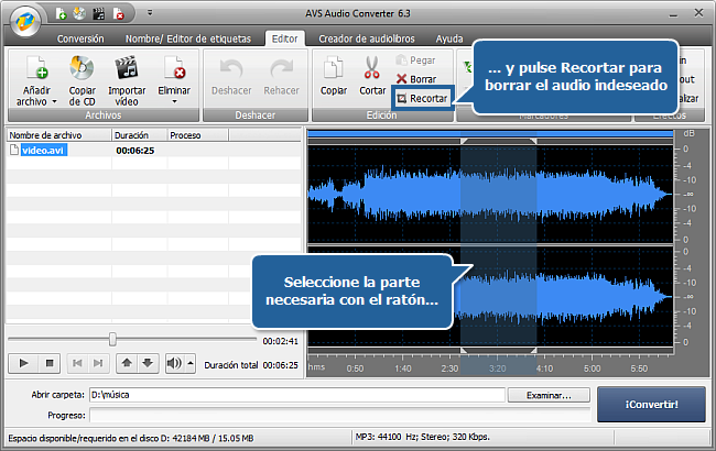 Si desea, digamos, sólo un fragmento de audio que dura 5 minutos, deberá marcar la parte necesaria de la pista antes de continuar.