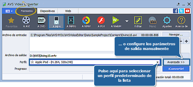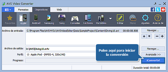 ¿Desea reproducir su vídeo casero en Apple iPod? ¿No sabe cómo pasar archivos de vídeo a un formato que sea compatible con este portátil? AVS Video Converter es el mejor programa para realizar esta tarea. Este conversor sencillo y potente le permitirá pasar DVDs a iPod (formato MP4/h.264) con un par de clics.