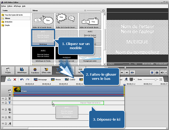 Maintenant choisissez un modèle avec le mot "Générique" dans la Zone Fichiers et effets et sans relâcher le bouton gauche de la souris faites-le glisser vers la ligne Texte et déposez-le sur la Timeline.