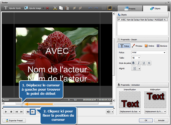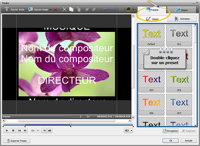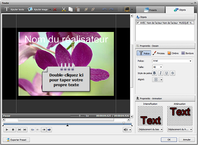 Si la police et la couleur du texte ne vous conviennent pas, ouvrez l'onglet Objets et réglez les paramètres suivants: Police, Pinceau, Ombre et Bordure ou sélectionnez un des presets (les paramètres du texte prédéfinis) mis à votre disposition dans l'onglet Presets.