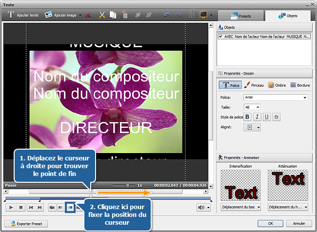 Déplacez le curseur à gauche pour trouver un moment approprié sur l'Ecran de prévisualisation. Puis cliquez sur le bouton Intensification situé sous l'Ecran de prévisualisation - c'est le moment où le générique s'arrête:
