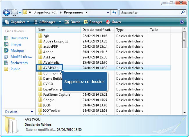 Vous devez effacer le dossier AVS4YOU: cliquez droit et sélectionnez Supprimer.