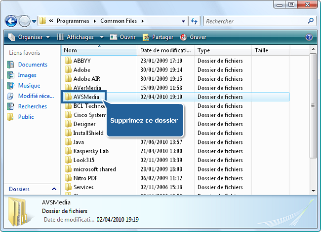 Tout en gardant l'explorateur Windows ouvert, allez à votre disque système, souvent C: drive\Program Files\Common Files pour supprimer le dossier AVSMedia. Cliquez droit et sélectionnez Supprimer.