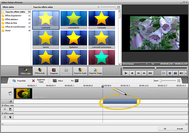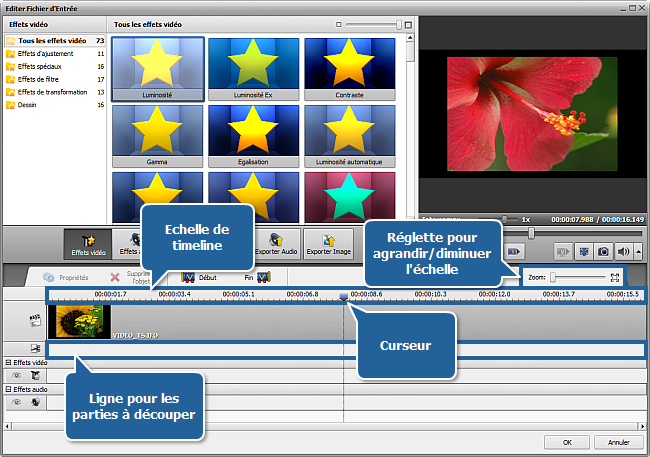 Les fichiers vidéo chargés dans le programme seront représentés sur la timeline. Les éléments suivants vous permettent d'effectuer le traitement vidéo: