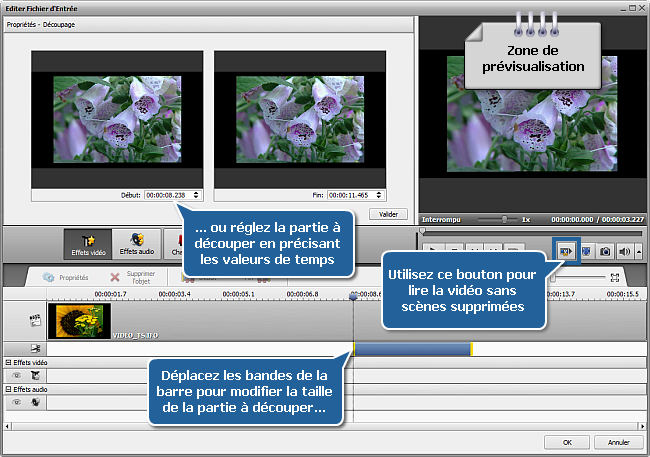 Pour lire la vidéo sans scènes supprimées utilisez le bouton Prévisualiser le résultat de découpage