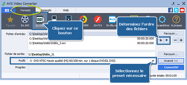 D'abord vous sélectionnez le fichier d'entrée ou quelques fichiers. Ensuite vous définissez des chapitres ce qui vous permettra de naviguer rapidement et facilement dans votre DVD.