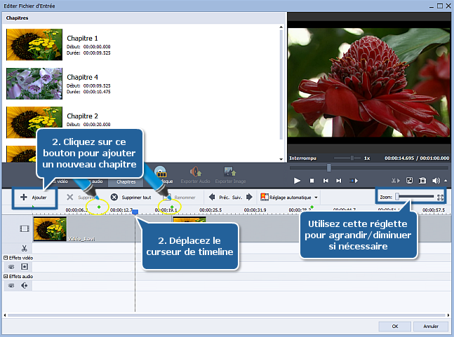 Cliquez gauche à l'intérieur de la timeline là où vous voulez placer un chapitre. Appuyez sur la touche F8 du clavier ou cliquez sur le bouton Ajouter ou cliquez droit et sélectionnez l'option appropriée depuis le menu contextuel pour enregistrer un nouveau chapitre. De cette manière vous pouvez ajouter plusieurs chapitres. Pour mettre des chapitres plus précisément, utilisez la réglette Zoom pour agrandir/diminuer la timeline.