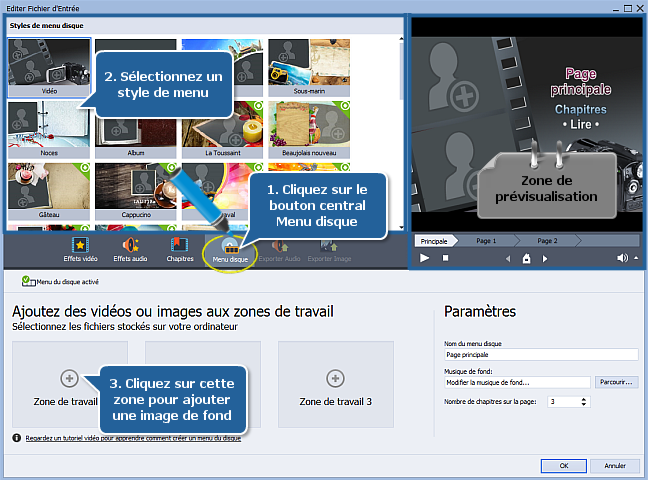 Sélectionnez un des styles pour votre menu en double-cliquant sur un preset ou en choisissant l'option Appliquer style de menu depuis le menu contextuel. Passez de la Page principale à la page Chapitres dans la Zone de prévisualisation. Pour ajouter vos propres images de fond, cliquez gauche sur les Zones de travail (si ces zones sont disponibles pour le style de menu sélectionné) en bas de la fenêtre Editer Fichier d'Entrée, choisissez l'image ou le fichier vidéo désiré dans la fenêtre ouverte et cliquez sur le bouton Ouvrir.