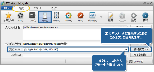 注: また、iPod 用にビデオを変換するためにメインツールバーの形式タブを使用できます。MP4 ボタンをクリックして、リストから必要な iPod プロファイルを選択するか、または出力パラメータを手で変更するために、詳細設定>>をクリックします。