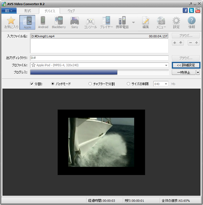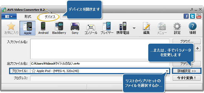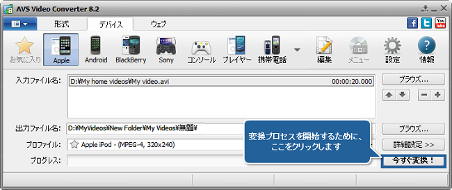 Apple iPod をお持ちなら、それを使用して、お気に入りホームビデオが見たくありませんか。でも、ファイルを iPod 互換形式に変換する方法がわからないのではないでしょうか。AVS Video Converter は、まさにこの問題を今すぐ解決するために適切なプログラムです。このシンプルでパワフルなビデオ・コンバータ・ユーティリティを使用したら、ほんの数回のクリックでホームビデオ・ライブラリを iPod (MP4/h.264) 形式に転送できます。