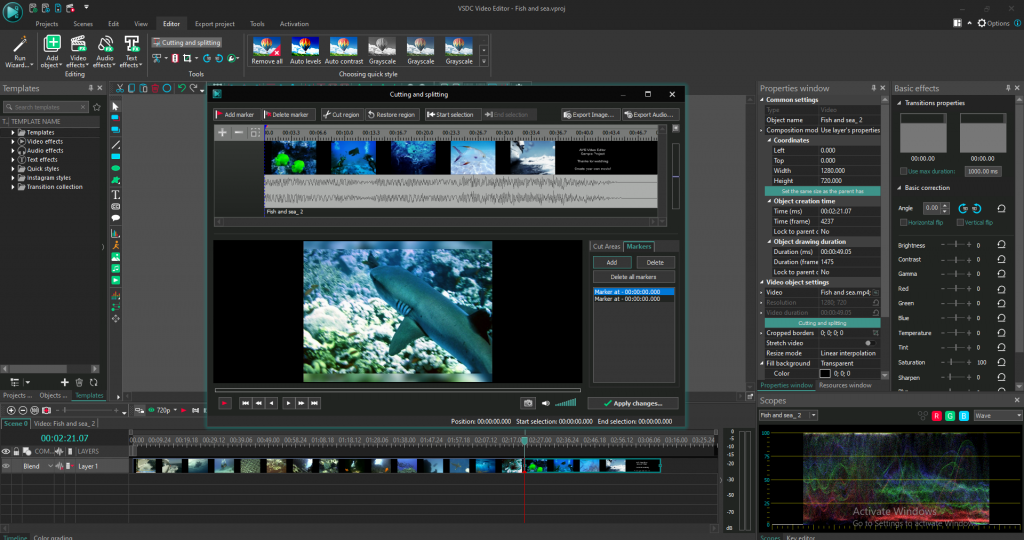 VSDC includes user-friendly cutting tools like Split and Multitrim, allowing beginners to easily edit longer videos. The Split tool divides footage into smaller parts, while the Multitrim option helps remove multiple unwanted segments in one session. If you want even quicker editing, there is Scene Detection feature. It automatically breaks the video into separate scenes based on content changes, making it simpler to trim and organize.