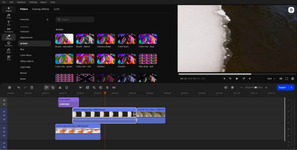 The editor includes a wide set of features: apart from common trimming, cutting, and applying transitions and titles, there are handy AI-driven features such as automatic subtitles, background removal, and noise reduction. There’s also fast motion tracking and timeline playback speeds up to 100x for timelapse videos.