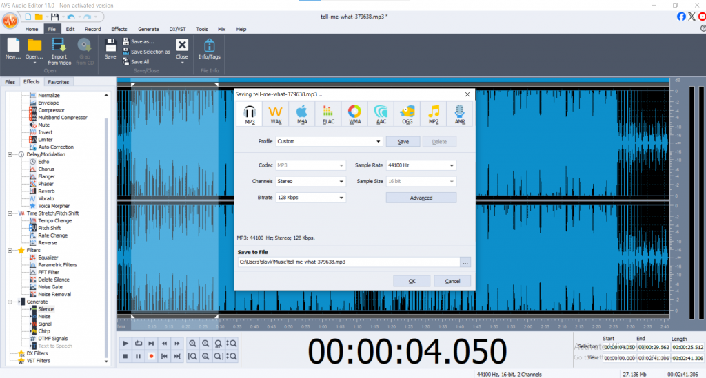 Once you’re satisfied with the result, it’s time to export your mix and share it with the world. Go to File → Save As, and choose your preferred format. MP3 is best for sharing online or sending by email, whereas WAV or FLAC ensures maximum sound quality. Export in M4A for mobile-friendly playback.