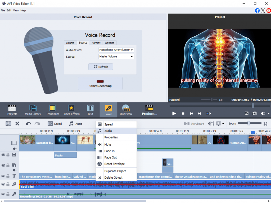 - Record or import your voice, then add background music at a low volume.