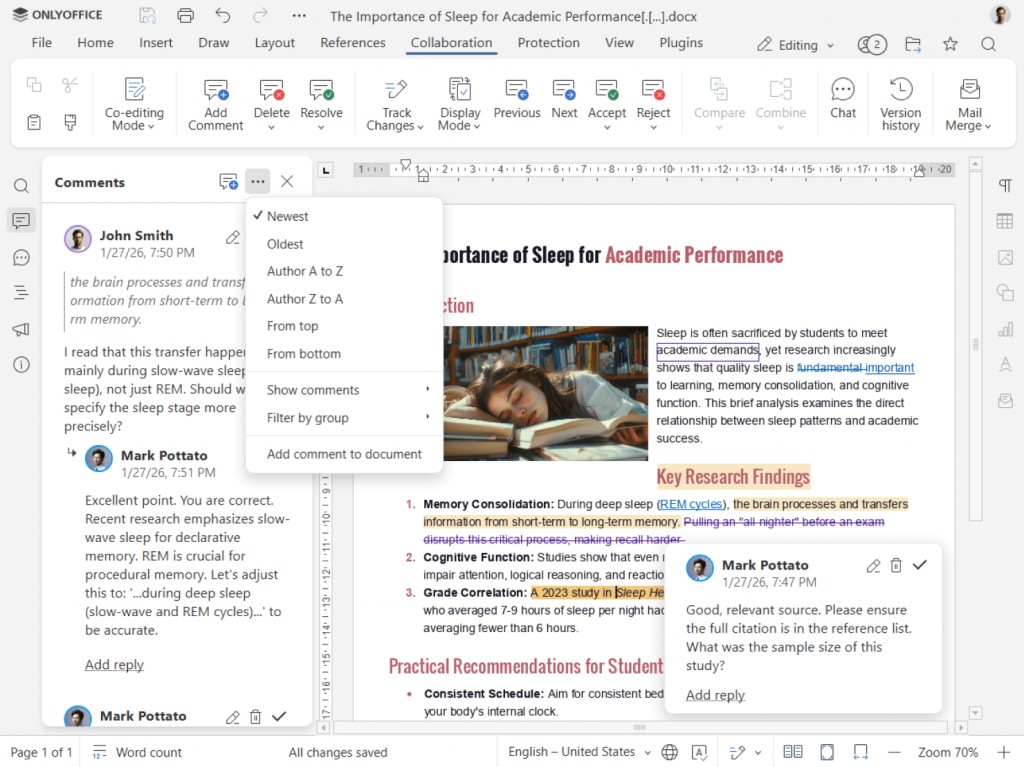 - Comments and track changes for feedback from teachers or classmates