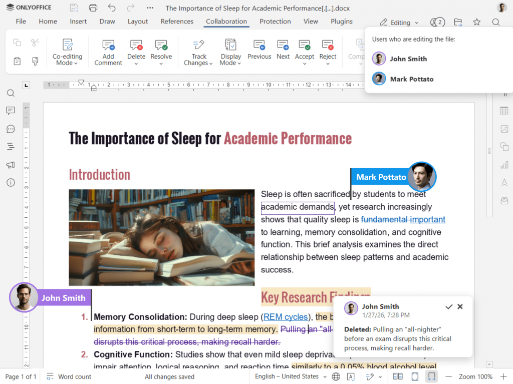 Speaking about academic software, document editing and teamwork are at the top of the list. ONLYOFFICE provides a complete office suite that helps students write, edit, and collaborate efficiently.