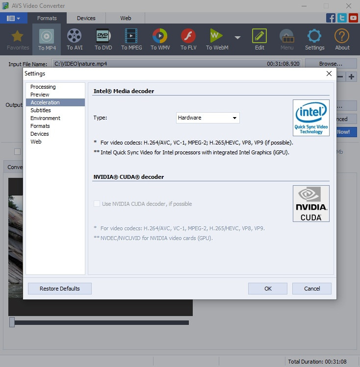 Im AVS Video Converter können Sie zwischen Hardware Intel® Media Decoder mit der Technologie Intel® Quick Sync und NVIDIA CUDA® Decoder mit NVDEC/NVCUVID wählen.