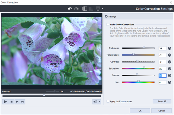 If you don’t have a lot of experience in video editing, AVS Video Editor allows you to correct colours automatically. You can also do it manually by adjusting such parameters, as brightness, temperature, contrast, saturation, gamma and hue. Changing these settings will make you video look exactly the way that you want it.