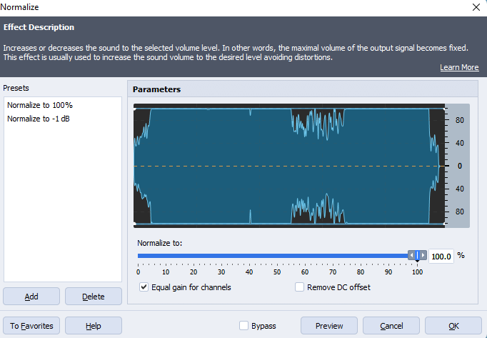 Audio normalization is a pretty popular effect used for mixing sounds and music production. This is one of the obligatory mastering steps for recording music albums, TV and radio streaming, where multiple tracks must sound equally loud. You can also normalize audio files online and on a computer for changing volume of a voice-over, for example.