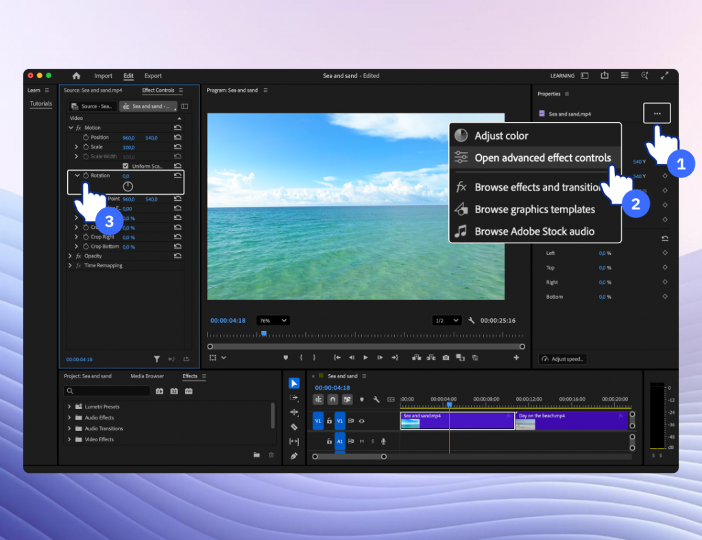 If you’re working with professional editing software, Adobe Premiere Pro gives you full control over video rotation. Here’s how to do it: