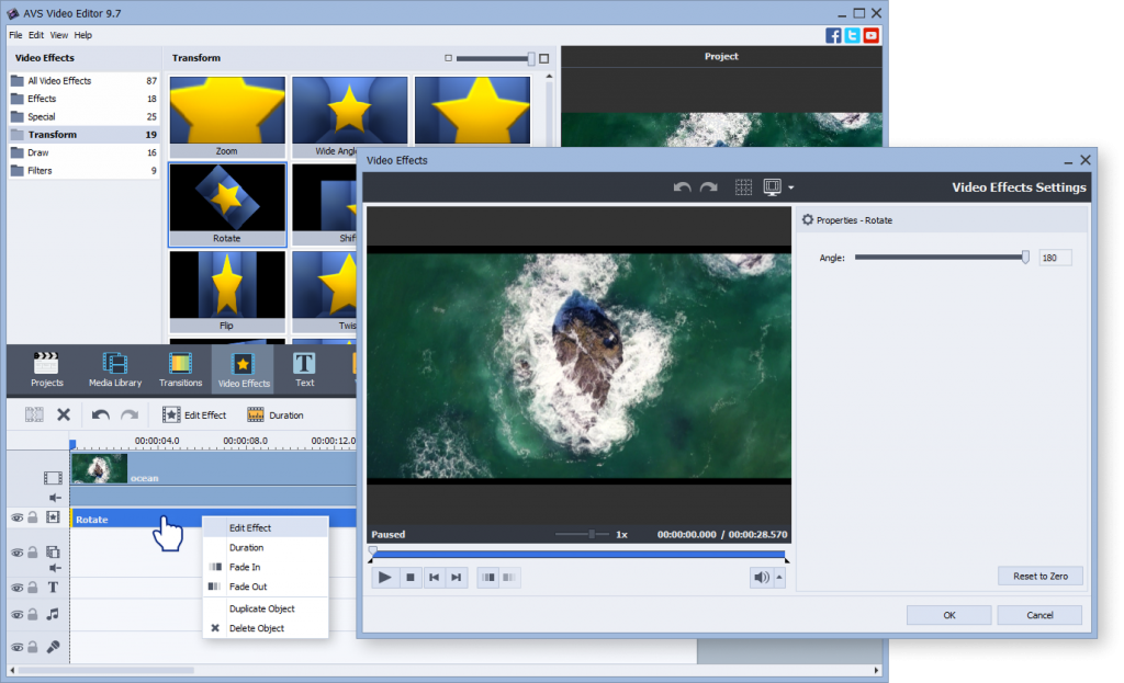 Step 3. Go to Effects >> Transform and select “Rotate“. Right click the button >> Edit effect and change the rotation angle (90°, 180°, 270°) until your video is oriented correctly. Alternatively, you may use Flip options.