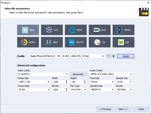 Passen Sie die Video- und Audioparameter einer Ausgabedatei in erweiterten Einstellungen an. Hier können Sie die Framegröße, die Bitrate, Codecs und mehr ändern.