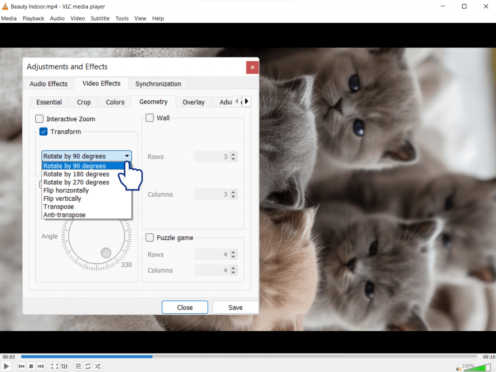 - VLC Media Player (Windows/Mac/Linux) – A versatile, free player that lets you rotate or flip during playback using the “Rotate” or “Transform” features. The video displays correctly as you watch, but the file remains unmodified.
