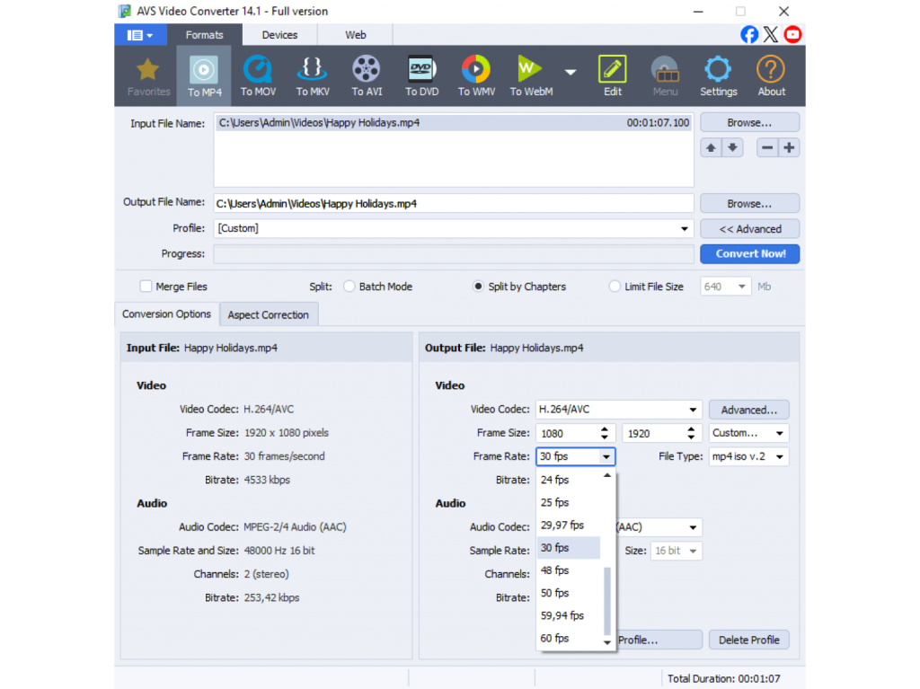 When your video is complete, export it in the recommended format for your target platform. AVS Video Editor offers a variety of presets for different devices, online platforms, and local storage. If you want to keep your video vertical, use AVS Video Converter and select MP4 format with these settings: 1080 × 1920 (vertical), H.264 codec, and 30 fps for a smooth, natural look.
