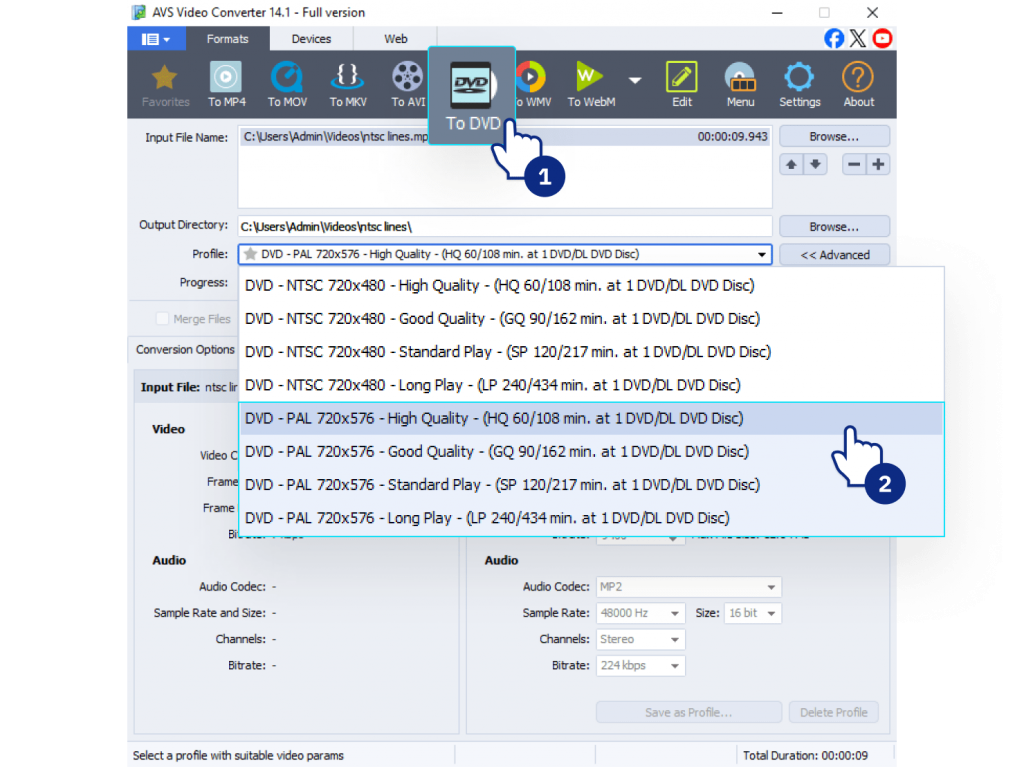 Choose DVD as a desired output format and select one of the PAL presets (e.g., “DVD PAL”, “DVD PAL MPEG2,” etc.) from the dropdown list. This ready-made preset automatically configures the correct frame rate (25 fps), resolution, and aspect ratio for you.