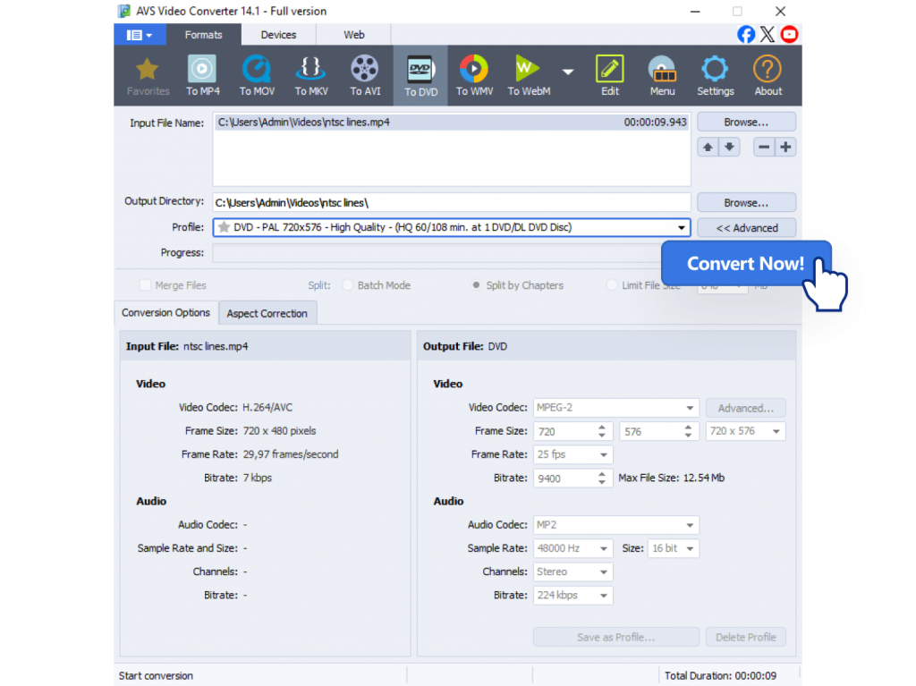 Choose an output folder for your converted file and click “Convert Now!” button. AVS Video Converter will automatically handle the change in frame rate (from 29.97 fps to 25 fps) and resolution.