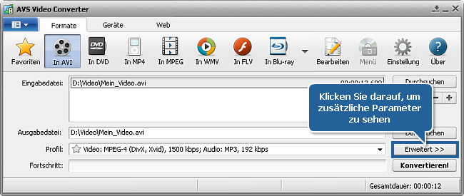 Nachdem Sie Ihre Eingabevideodatei gewählt haben, achten Sie auf die Registerkarte Formate der Hauptsymbolleiste im oberen Bereich des Fensters vom AVS Video Converter (klicken Sie auf den Button "Weitere Formate", um die Symbolleiste mit den weiteren Formaten nach Bedarf zu öffnen). Klicken Sie auf den Button entsprechend dem Dateiformat des Eingabevideos: