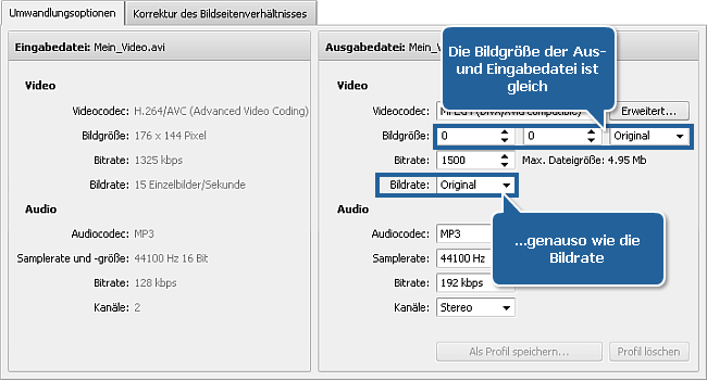 Wenn sich die entsprechenden Werte der Ausgabedatei für Videogröße und Bildrate unterscheiden, korrigieren Sie sie, indem Sie die gleichen Werte wie bei der Eingabedatei in die entsprechenden Kontrollfelder der Ausgabedatei eingeben.