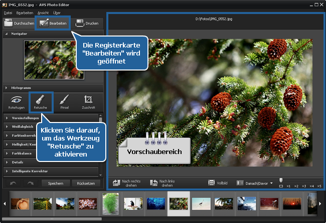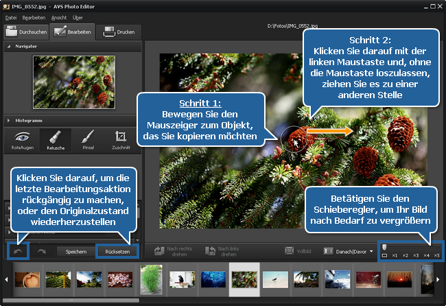 Sie können mit dem Werkzeug Retusche nach Ihrem Wunsch experimentieren. Wenn Sie mit dem Ergebnis nicht zufrieden sind, kann man die letzte Aktion rückgängig machen, indem man den Button Rückgängig machen anklickt, oder den Originalzustand des Bildes wiederherstellen, indem man den Button Rücksetzen anklickt. Diese Buttons befinden sich im unteren Bereich der Registerkarte Bearbeiten.