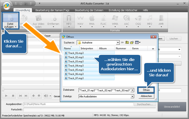 Um eine oder mehrere Audiodateien ins Programm zu laden, klicken Sie auf den Button Datei zufügen. Im geöffneten Fenster von Windows Explorer wählen Sie gewünschte Dateien und klicken Sie auf den Button Öffnen.