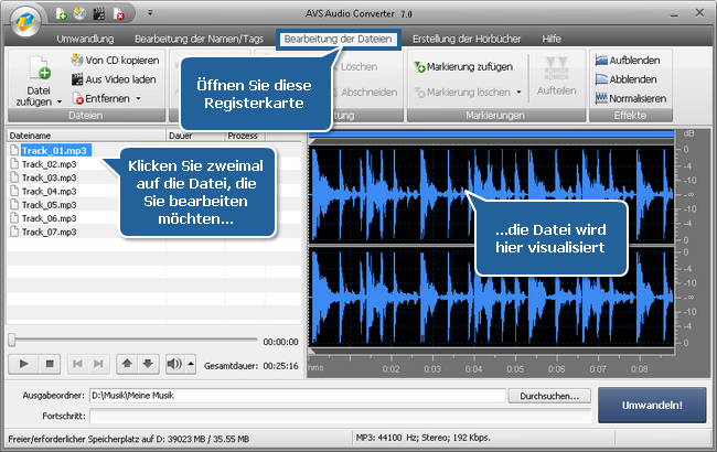 Vor der Erstellung des Hörbuches kann man Ihre Eingabedateien bearbeiten, wenn man einige unnötige Abschnitte entfernen oder z.B. den Effekt "Normalisieren" anwenden möchte.