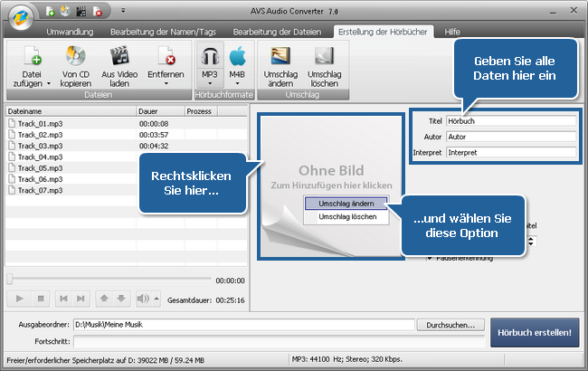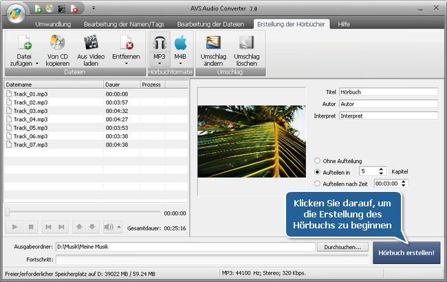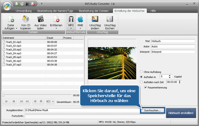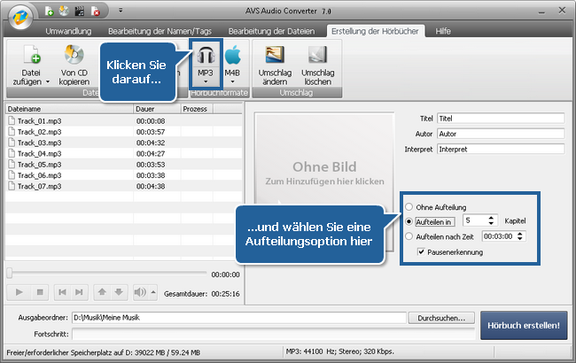 Hinweis: In dieser Anleitung schlagen wir vor, Ihr Hörbuch im MP3-Format zu erstellen, aber der