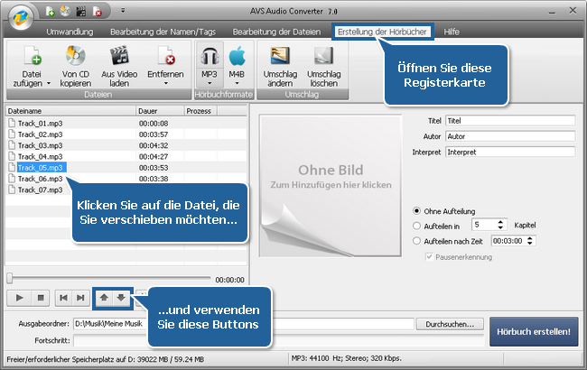 Wenn Sie mehrere Audiodateien geladen haben, bestimmen Sie die nötige Reihenfolge der Tracks durch Anklicken der Datei, deren Position geändert werden muss, und Betätigen des Buttons Aufwärts oder Abwärts unterhalb der Umwandlungsliste.