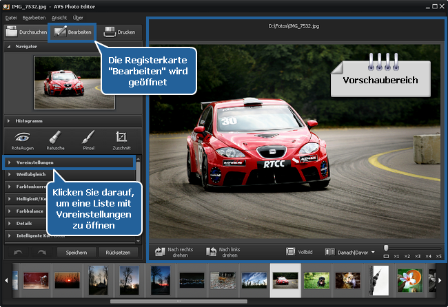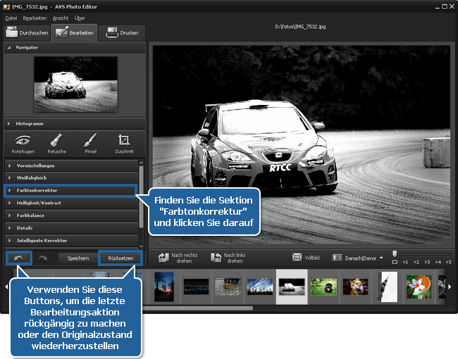 Sie können mit diesen Einstellungen nach Ihrem Wunsch experimentieren. Wenn Sie mit dem Ergebnis nicht zufrieden sind, kann man die letzte Aktion rückgängig machen, indem man den Button Rückgängig machen anklickt, oder den Originalzustand des Bildes wiederherstellen, indem man den Button Rücksetzen anklickt. Diese Buttons befinden sich im unteren Bereich der Registerkarte Bearbeiten.
