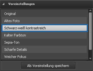 Danach wird die Sektion geöffnet, damit Sie eine Voreinstellung aus der Liste wählen könnten. Klicken Sie auf die Voreinstellung Schwarz-weiß kontrastreich.