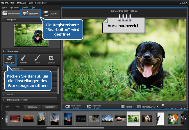 Aber man kann rote Augen innerhalb der Bedienfläche des Programms AVS Photo Editor mit dem Werkzeug Rote-Augen-Korrektur sehr einfach entfernen.