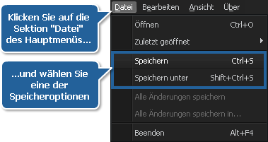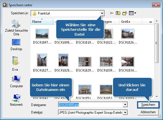 Geben Sie einen Namen innerhalb des Feldes Dateiname ein und wählen Sie eine Speicherstelle mit Hilfe von den Navigationsbuttons auf der linken Seite oder dem Listenmenü Speichern in. Dann klicken Sie auf den Button Speichern im unteren Bereich des Fensters.