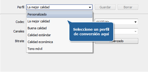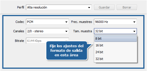 Si ninguno de los perfiles responde a sus necesidades, puede ajustar los parámetros del formato de salida. Todos los parámetos de audio disponibles para la edición se encuentran bajo el campo Perfil. Para cambiar un parámetro predeterminado, seleccione un valor deseado en la lista desplegable del campo apropiado: