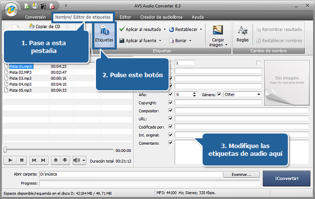 Etiquetas son la información de texto acerca de un archivo de audio, tal como el nombre y número de la canción, su autor y fecha de salida etc. Merece la pena rellenar los campos de etiquetas porque muchos reproductores de audio utilizan etiquetas más que nombres de archivos a la hora de reproducir archivos de audio.