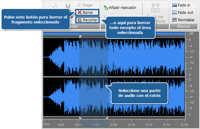 - seleccione una parte del audio con ratón en el área de edición y use el botón Borrar para borrar el fragmento seleccionado.